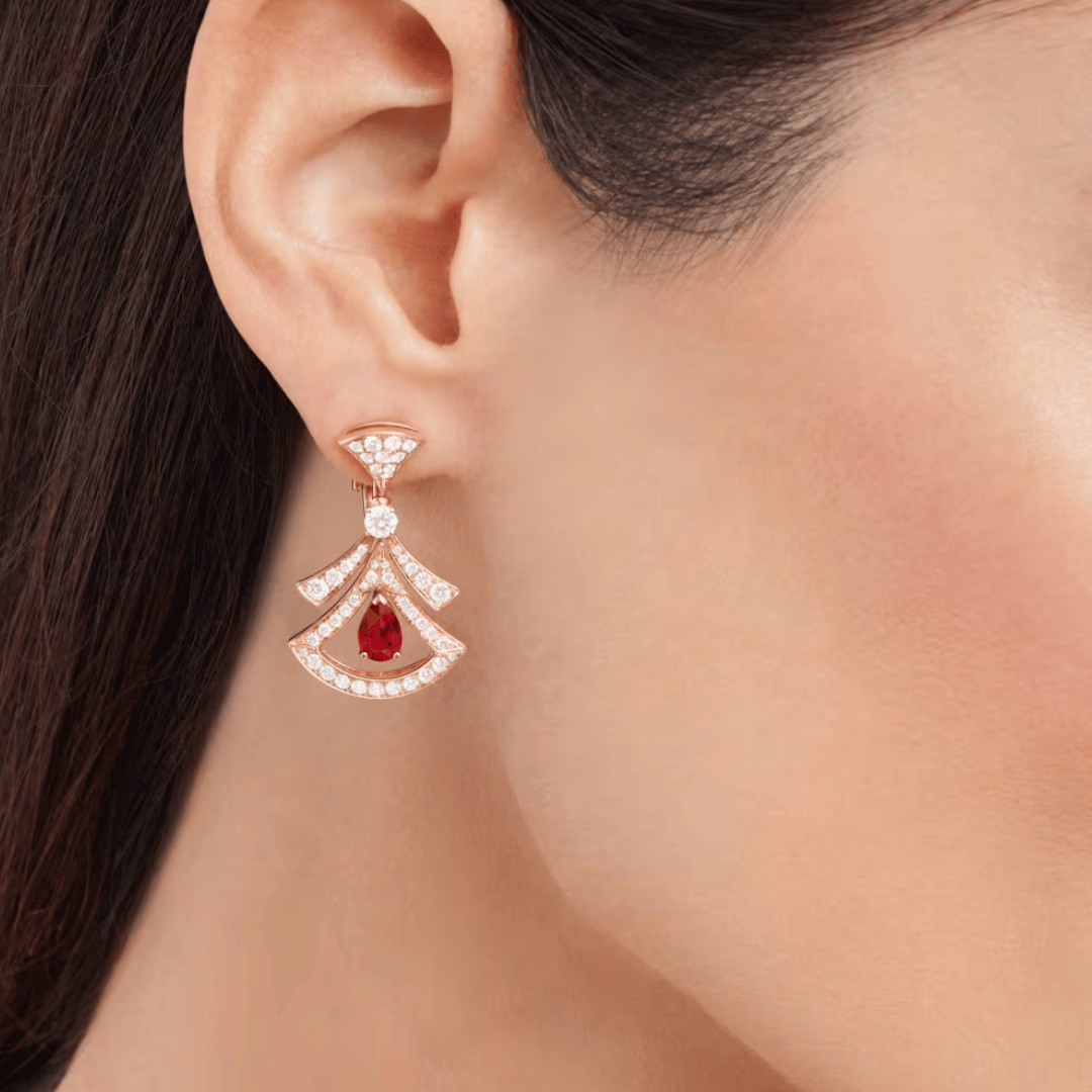 Divas’ Dream 18 kt rose gold openwork earrings, set with pear-shaped rubies, round brilliant-cut and pavé diamonds.