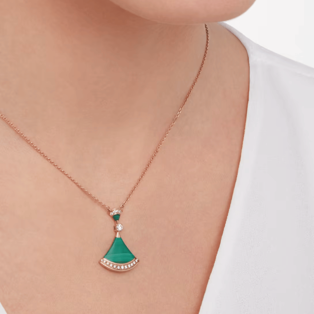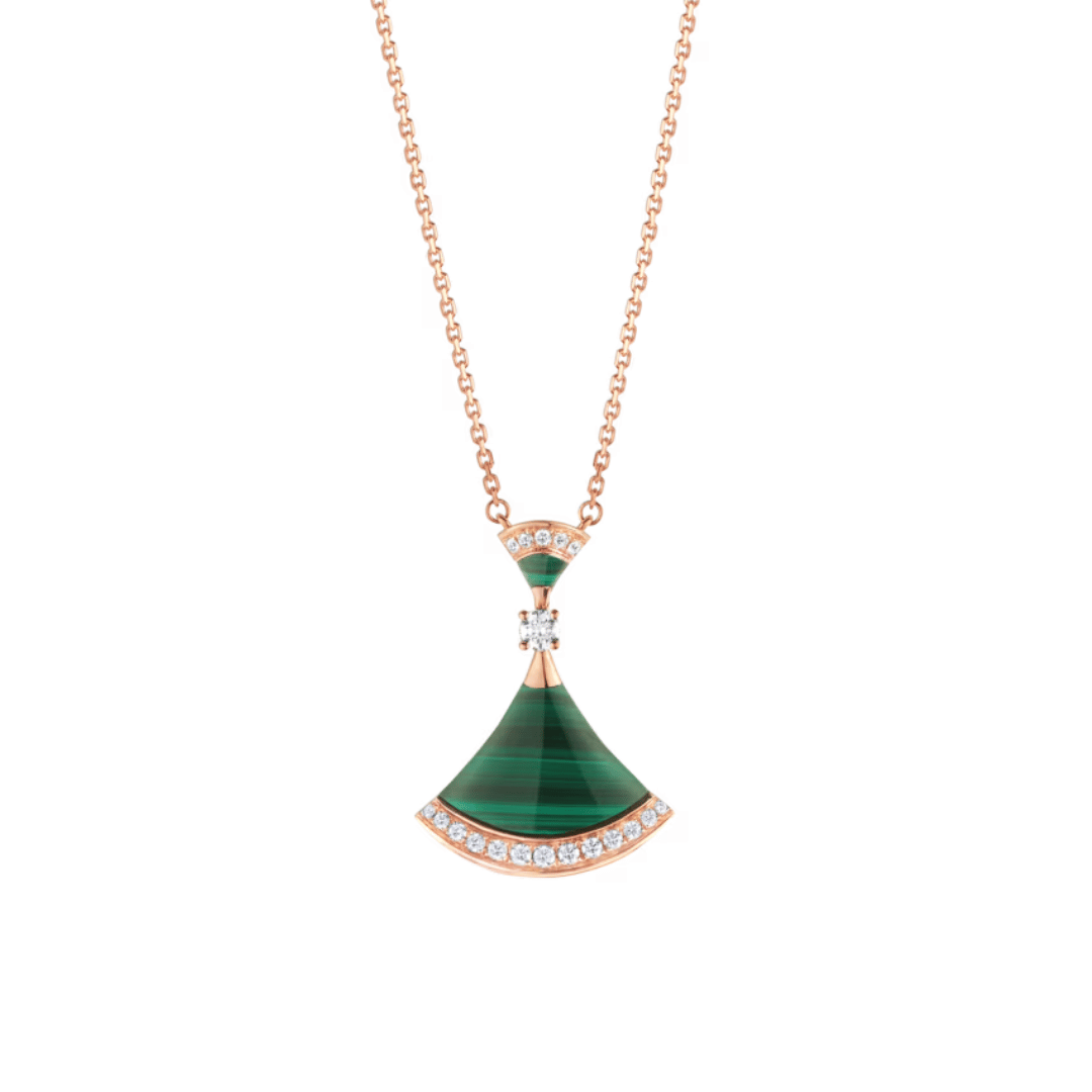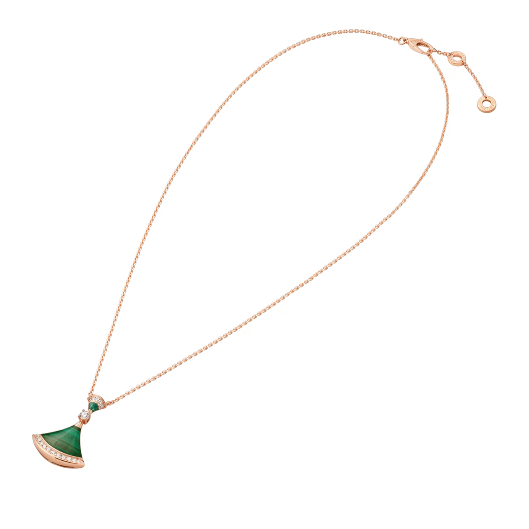 Divas’ Dream necklace in 18 kt rose gold with pendant set with a diamond, malachite elements and pavé diamonds.
