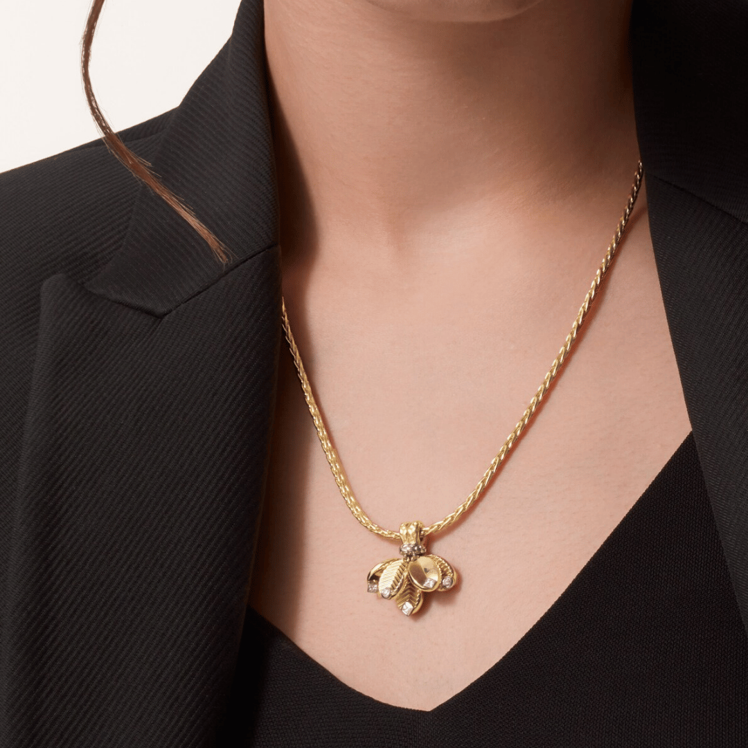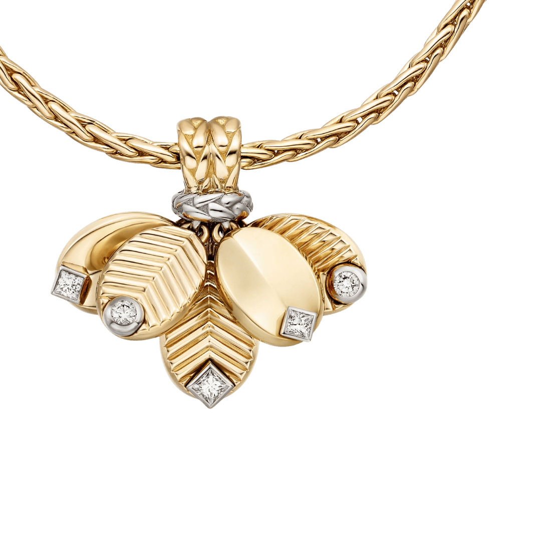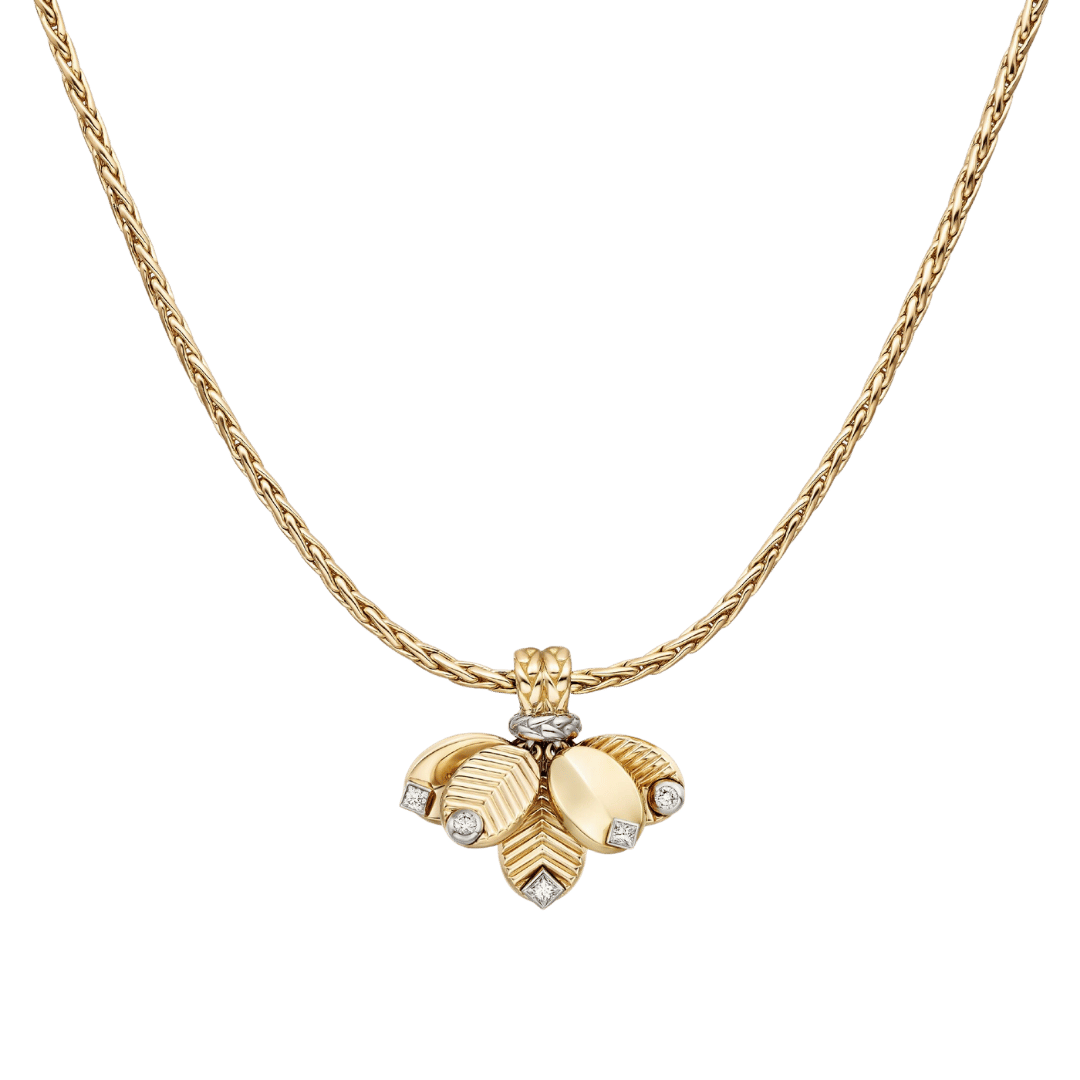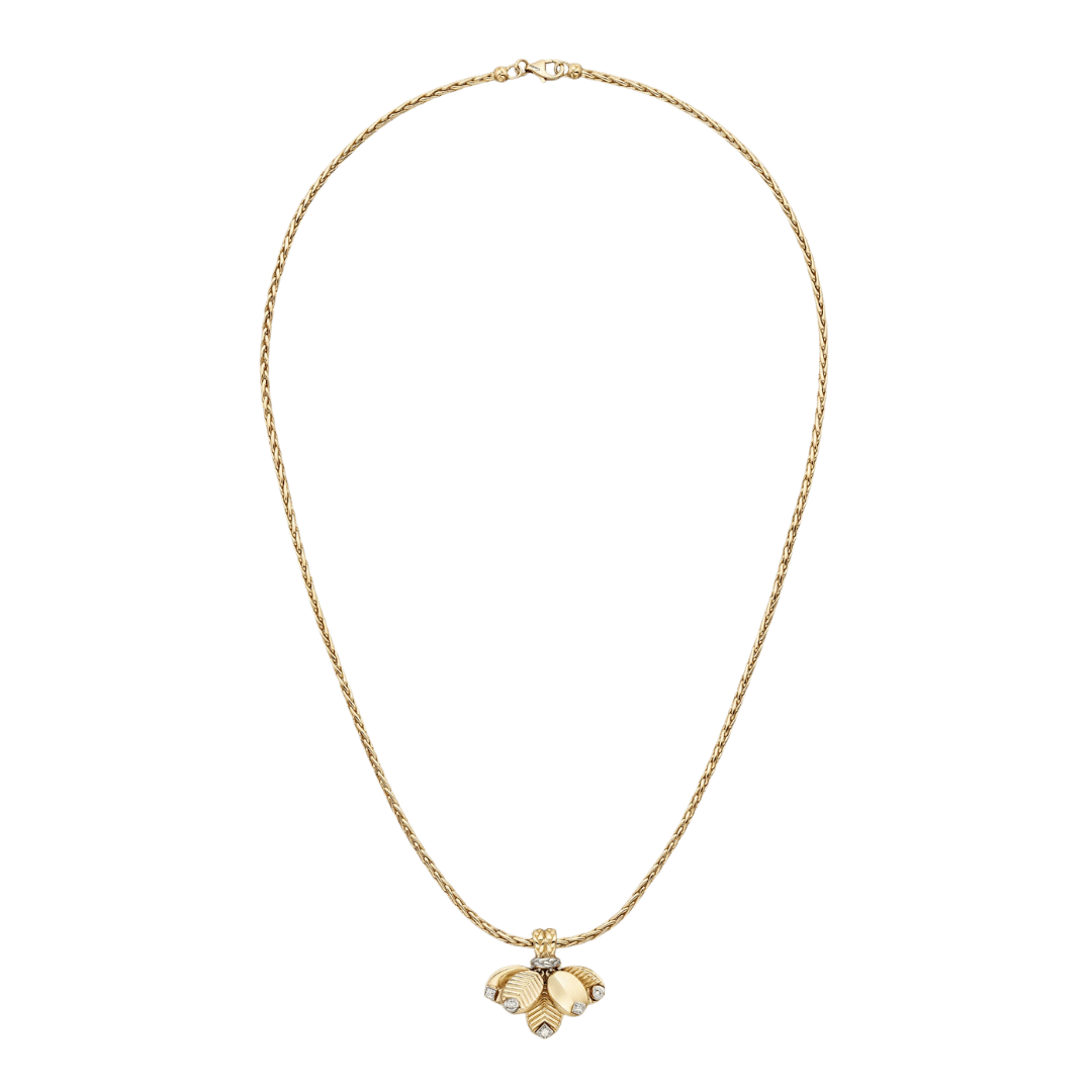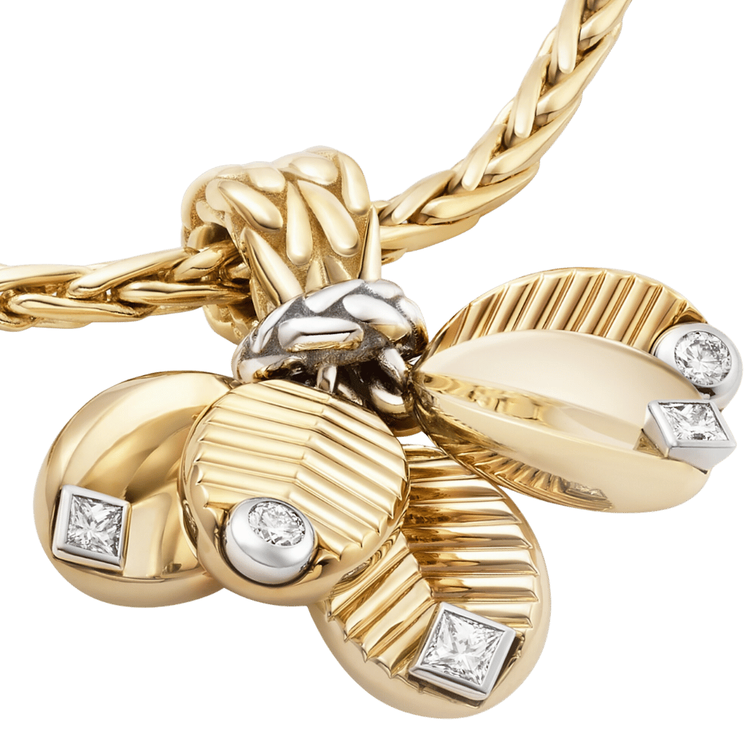 Grain de café necklace, 18k yellow gold , 18k white gold , set with 2 brilliant-cut diamonds and 3 princess-cut diamonds totaling 0.12 carats