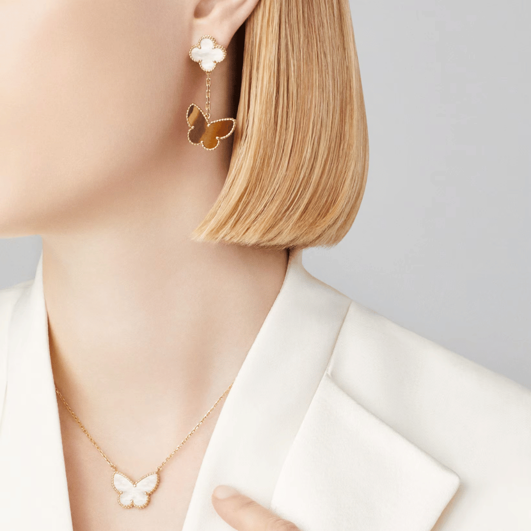 Lucky Alhambra earrings, 2 motifs, 18K yellow gold, white mother-of-pearl, tiger’s eye.