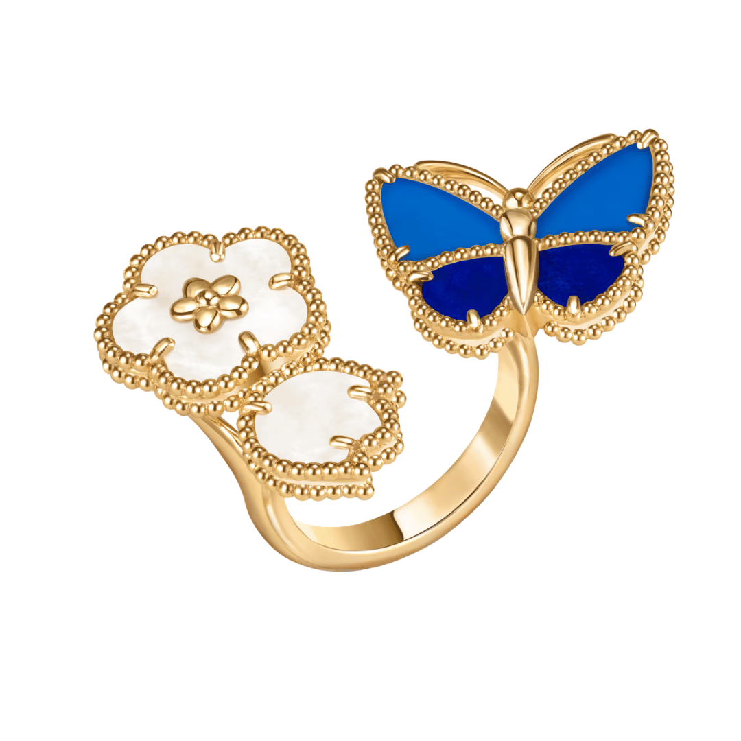 Lucky Spring Butterfly Between the Finger ring, 18K yellow gold, lapis lazuli, blue agate, white mother-of-pearl.