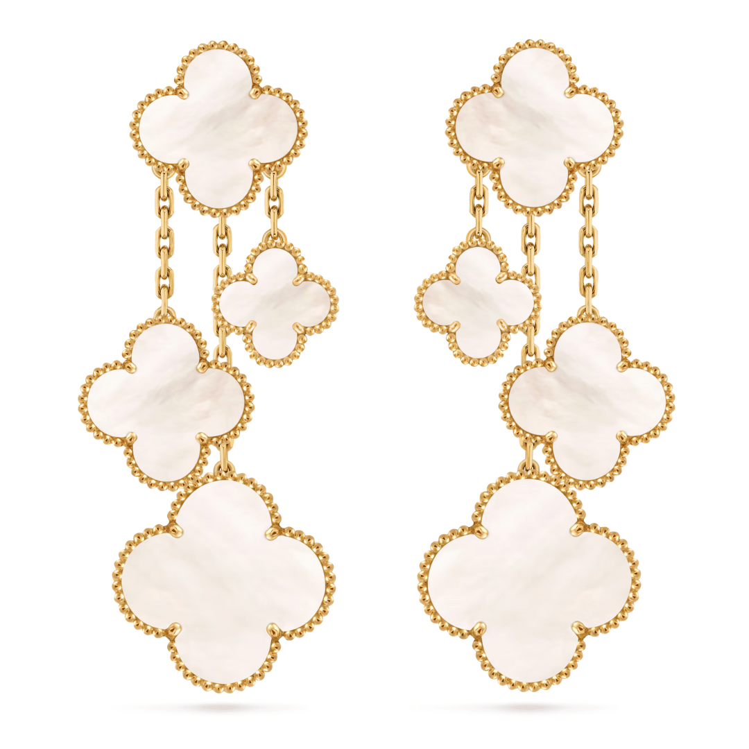 Magic Alhambra earrings, 4 motifs, 18K yellow gold, white mother-of-pearl.