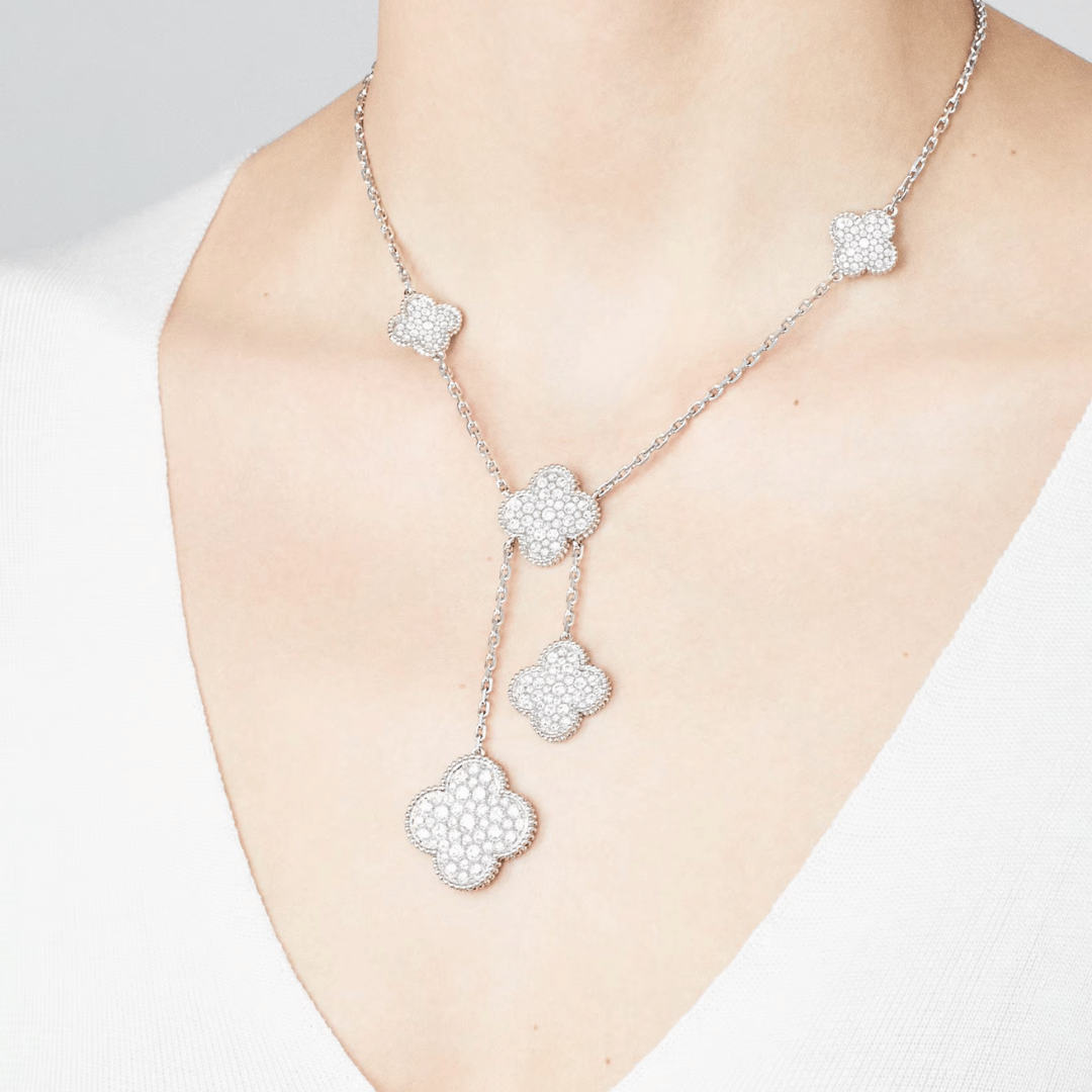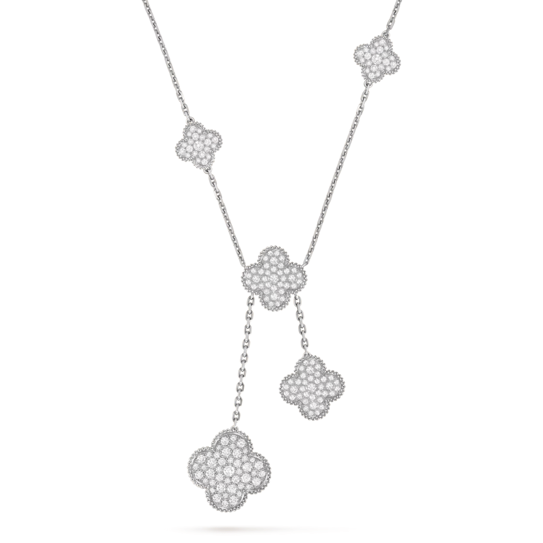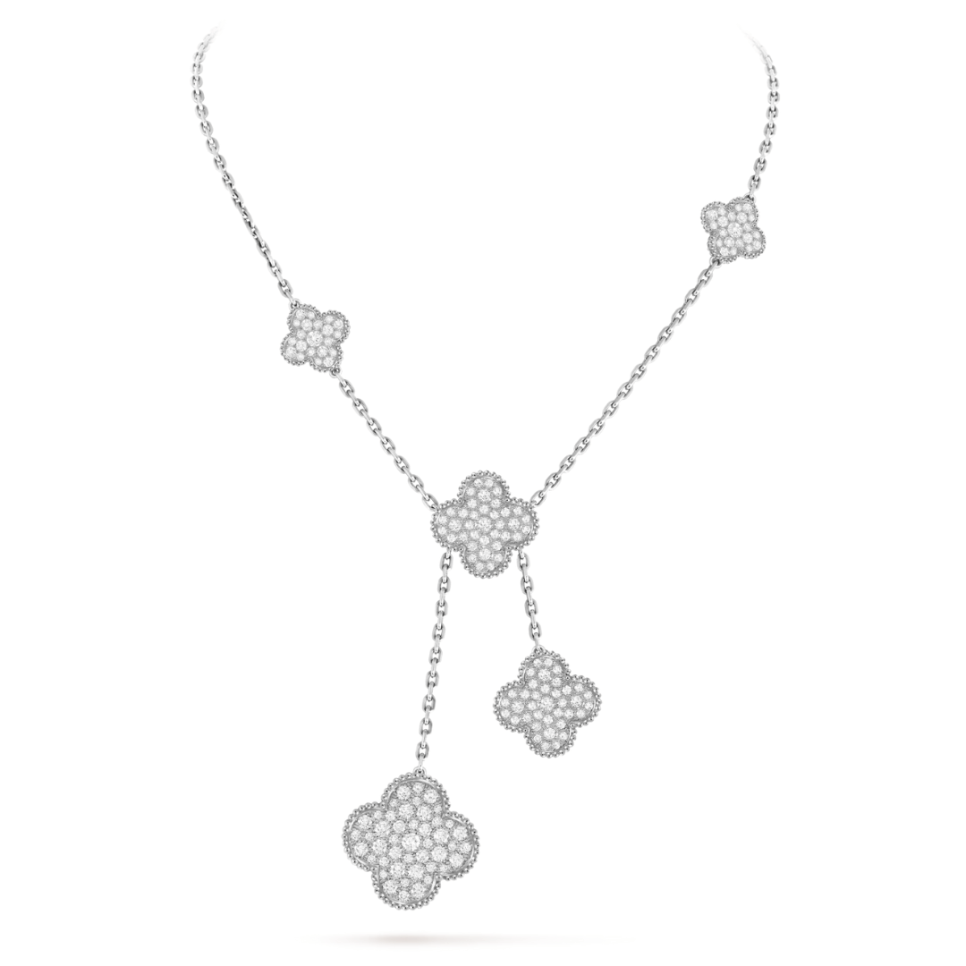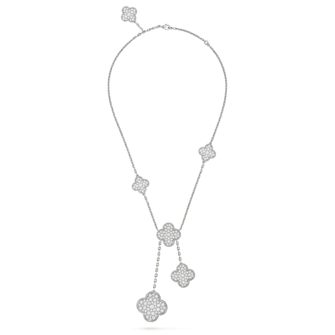 Magic Alhambra necklace, 6 motifs, rhodium plated 18K white gold, round diamonds;