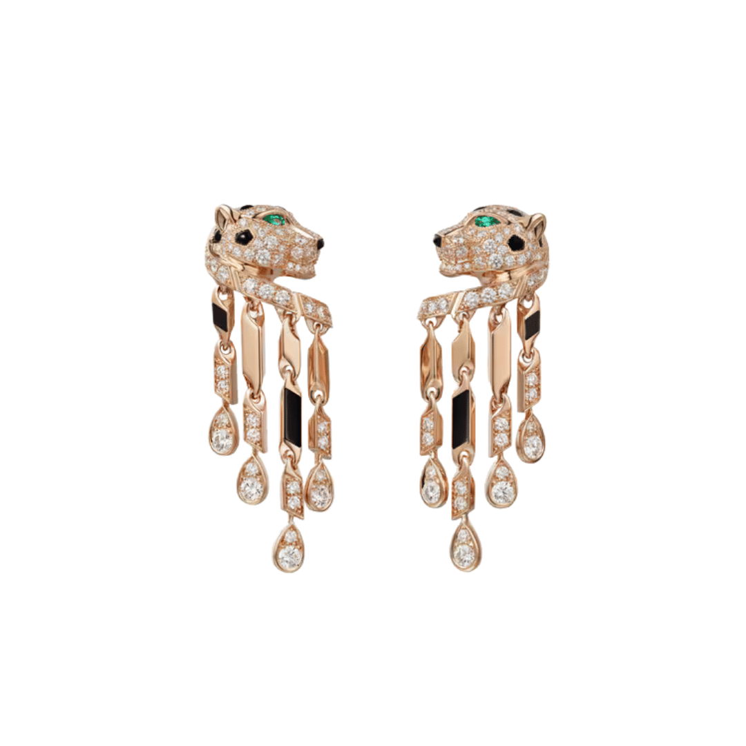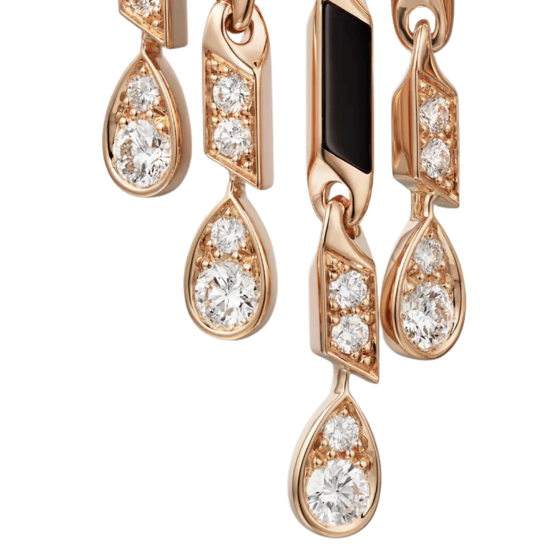 8K rose gold (750/1000), each set with 73 brilliant-cut diamonds totaling 2.98 carats, emerald and onyx.