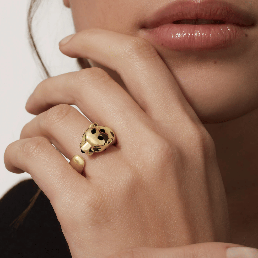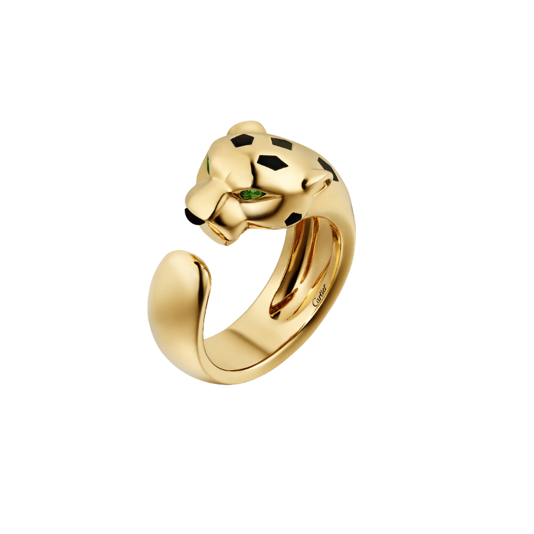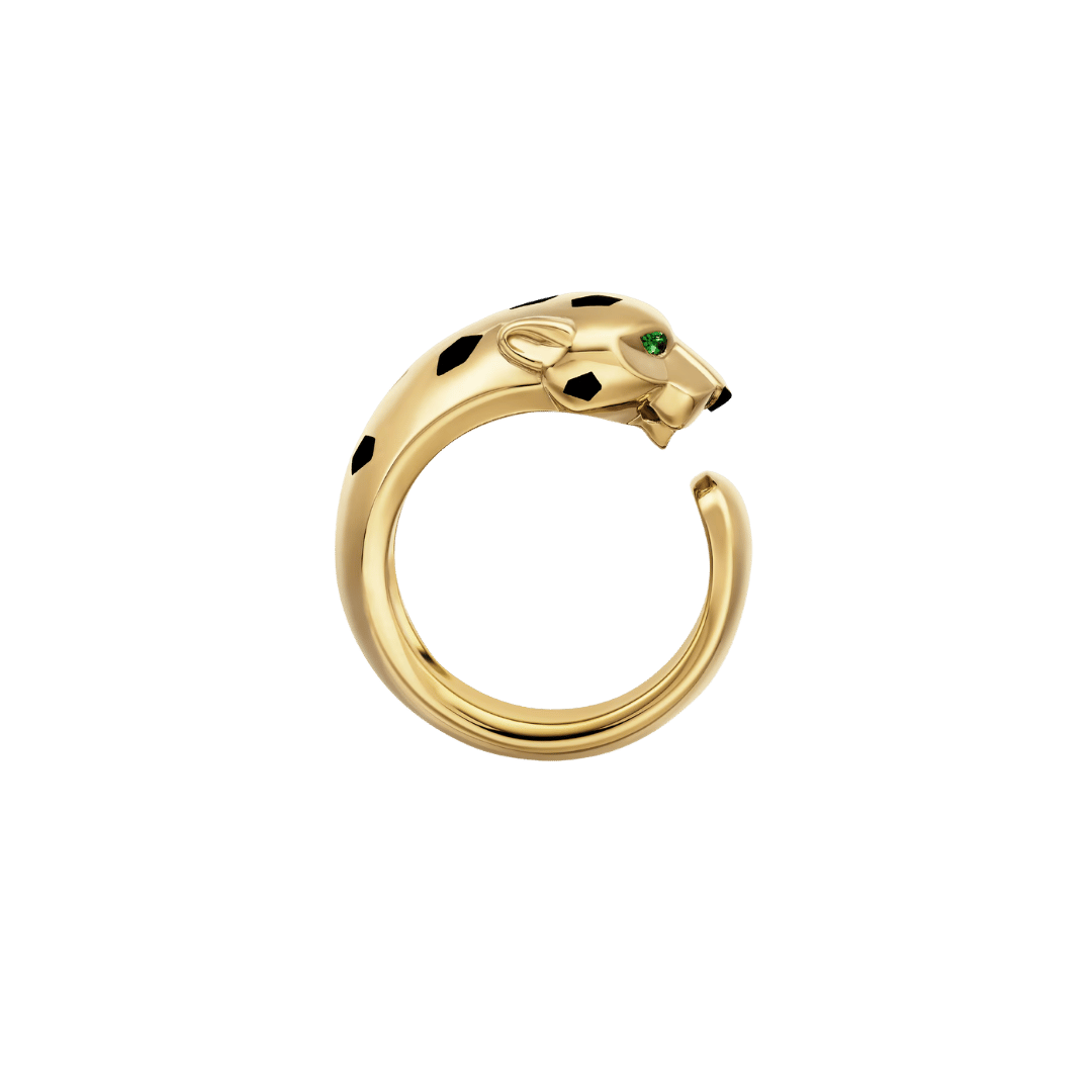 Panthère Ring, yellow gold 750/1000, onyx, black lacquer, set with 2 tsavorite garnets.