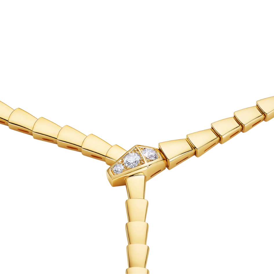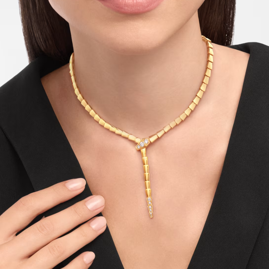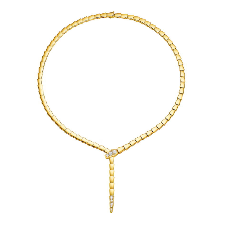 Serpenti 18 kt white gold pendant necklace set with emerald eyes, a blue sapphire and pavé diamonds on the chain and head