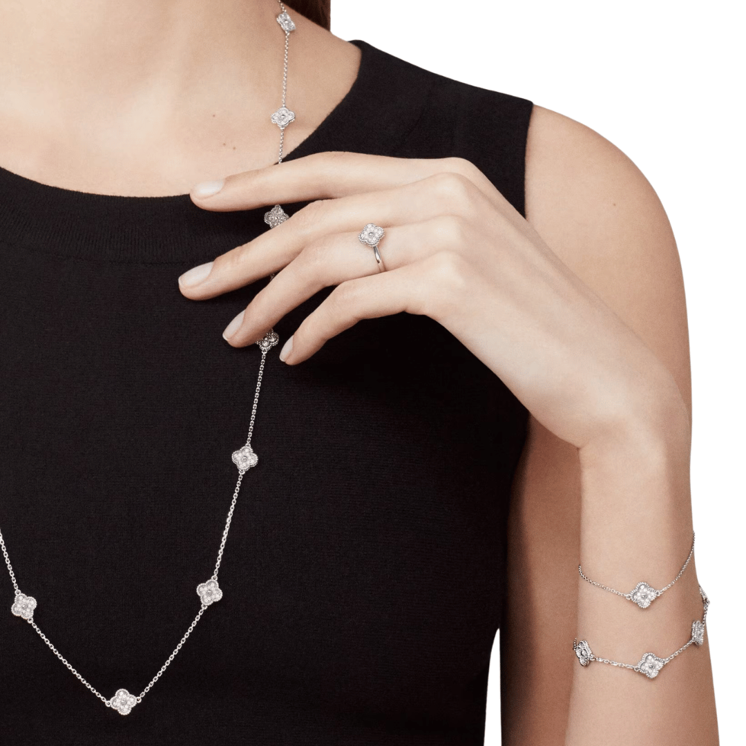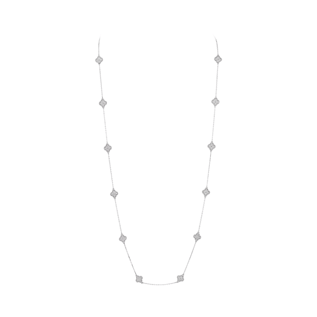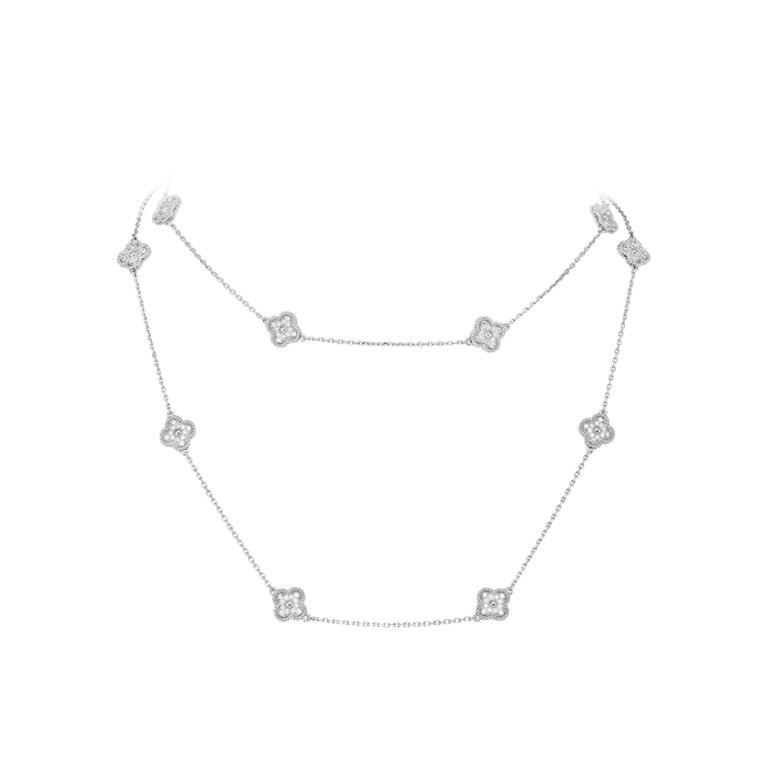 Sweet Alhambra long necklace, 16 motifs, 18K white gold, round diamonds