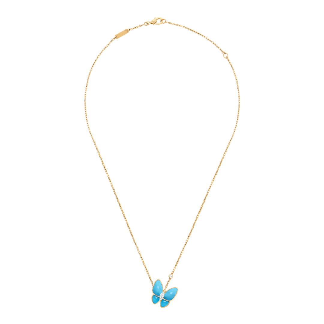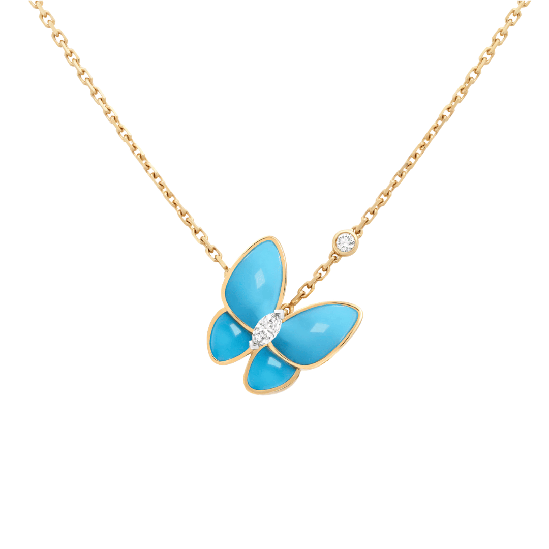Two Butterfly pendant, 18K yellow gold, turquoise, round diamond, rhodium plated 18K white gold, marquise-cut diamond