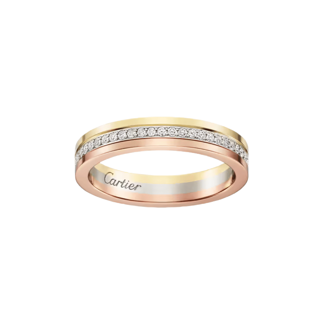 Vendôme Louis Cartier Wedding Band, rose gold (750/1000), 18K white gold (750/1000), 18K yellow gold (750/1000), set with 53 brilliant-cut diamonds totaling 0.23 carats. Width: 3.5 mm