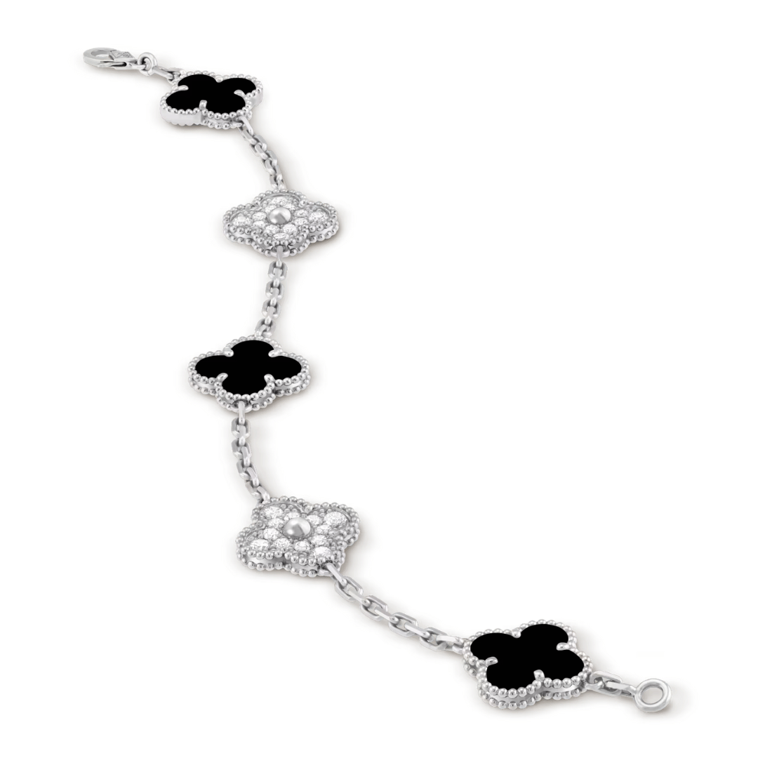 Vintage Alhambra bracelet, 5 motifs, 18K white gold, onyx, round diamonds