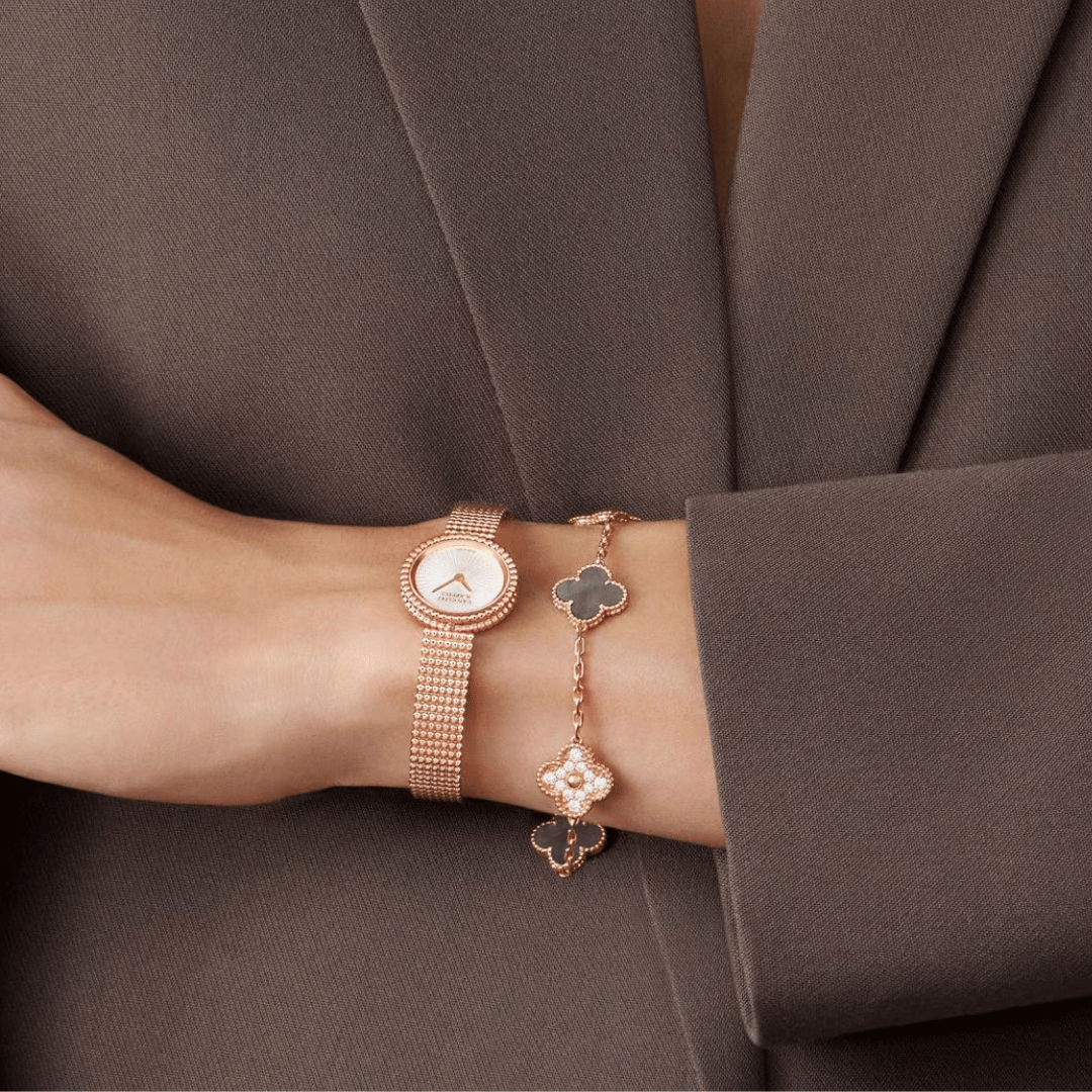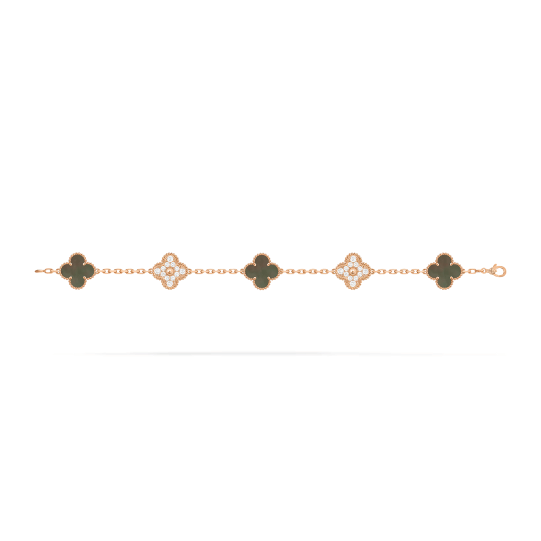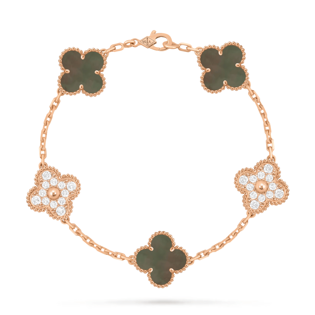 Vintage Alhambra bracelet, 5 motifs, 18K rose gold, gray mother-of-pearl, round diamonds